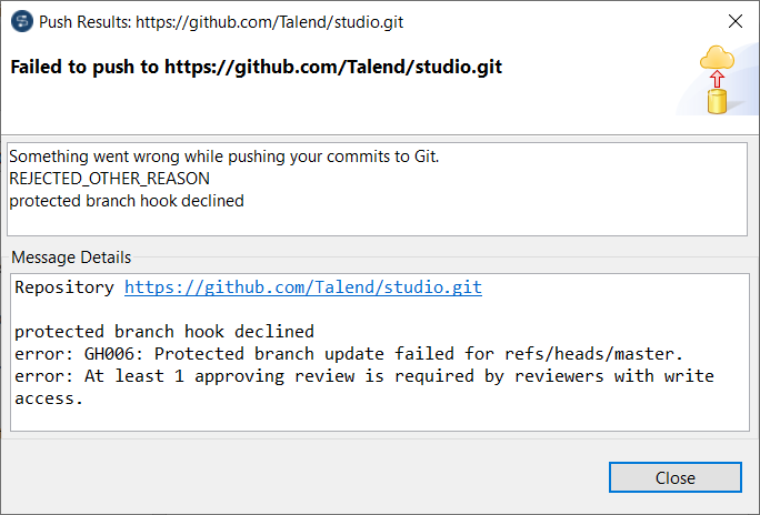Talend Studio now displays more specific error messages for Git operations on a protected branch.
