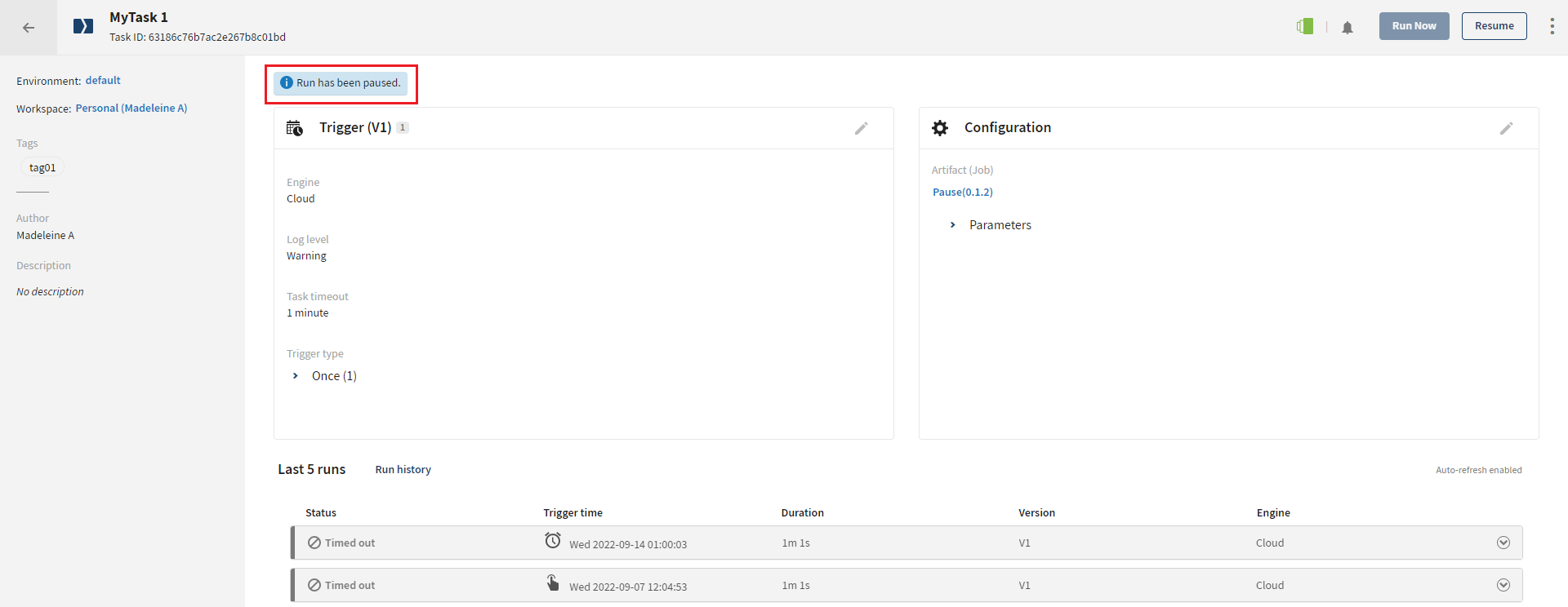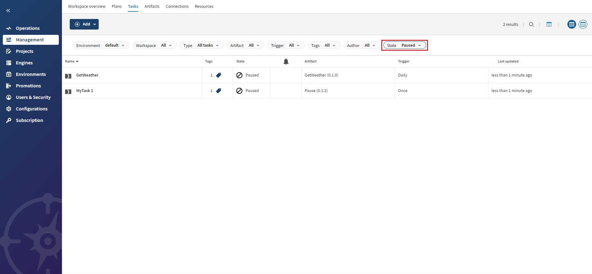 You can now pause or resume task and plan executions, for example when fixing an issue for a failed task or plan or during a maintenance period, to make sure no executions will happen during these events. You can pause and resume a task or plan from its details page or from the Tasks or Plans tabs. Once paused, no executions will be possible for this task or plan