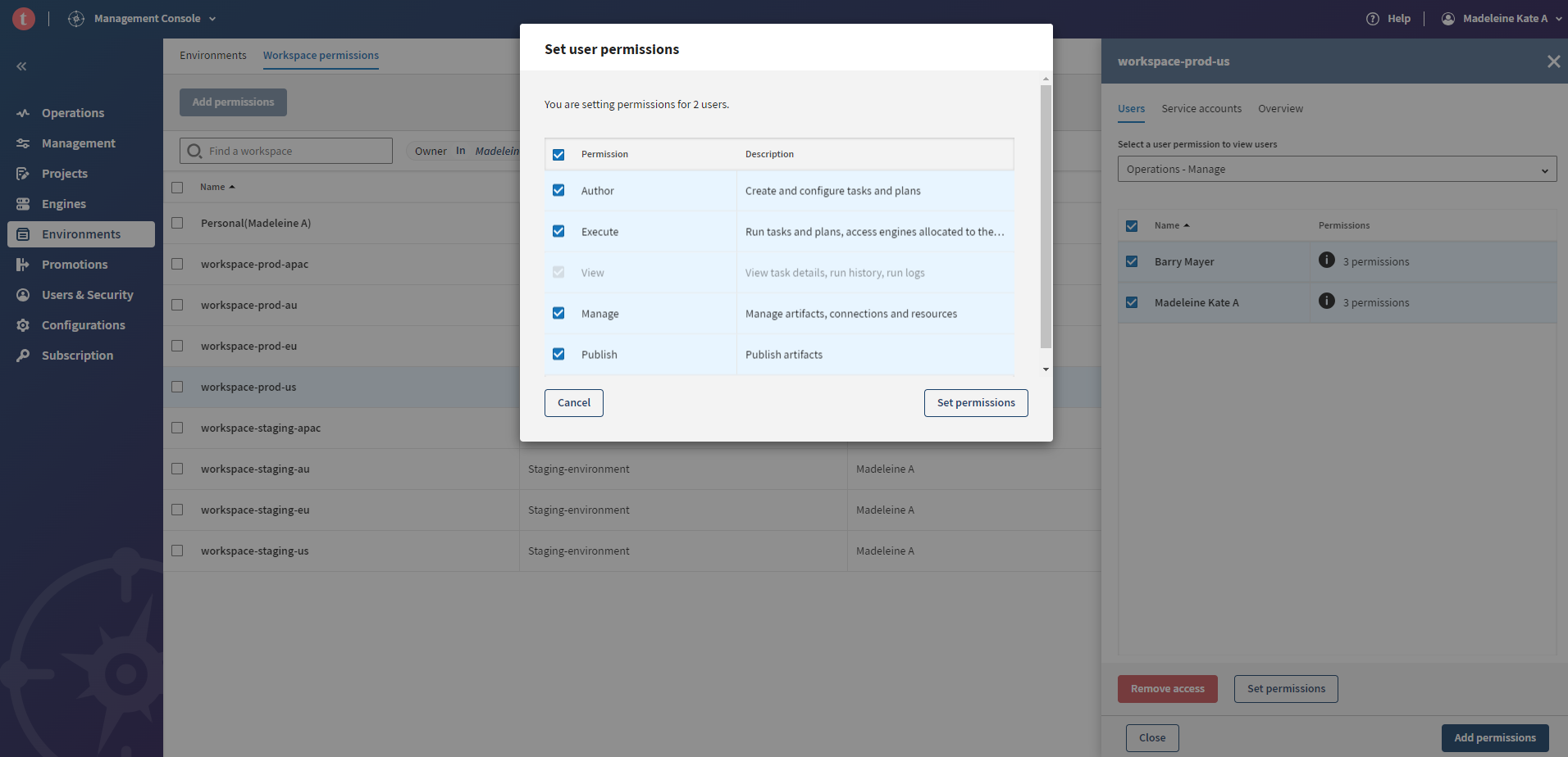 For more information, see Assigning permissions for a single workspace and Assigning permissions for multiple workspaces. |