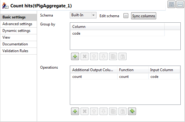 - In the Operations area, click the [+] button to add a line in the table, and select the column count in the Additional Output Column field, select count in the Function field, and select the column code in the Input Column field.