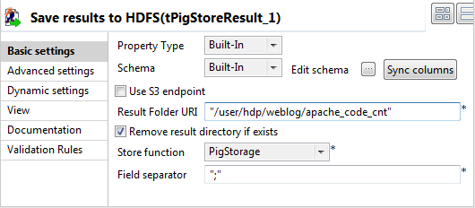 - In the tPigStoreResult component, fill the Result file URI field with /user/hdp/weblog/apache_ip_cnt.