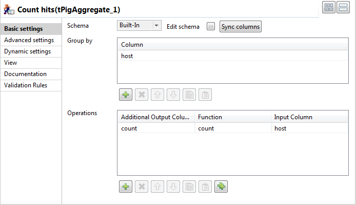 - In the Basic settings view of the tPigAggregate component, click Sync columns to retrieve the schema from the preceding component, and permit the schema to be propagated to the next component.