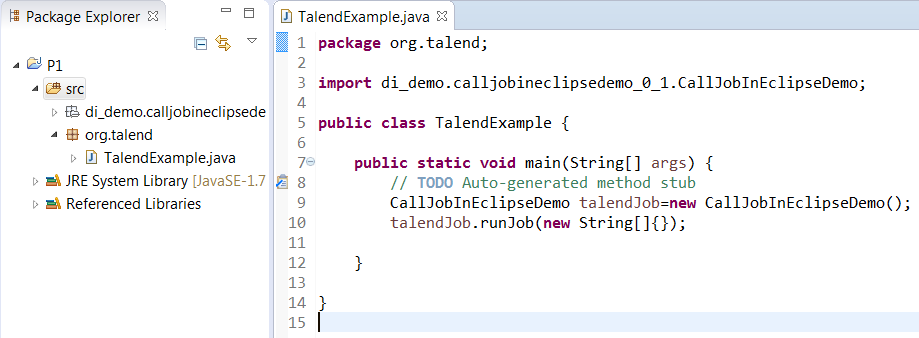package org.talend; import di_demo.calljobineclipsedemo_0_1.CallJobInEclipseDemo; public class TalendExample { public static void main(String[] args) { // TODO Auto-generated method stub CallJobInEclipseDemo talendJob=new CallJobInEclipseDemo(); talendJob.runJob(new String[]{}); } }