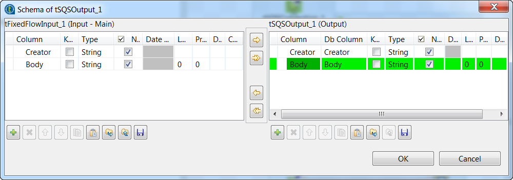 You can see the schema of the tSQSOutput component is predefined with a single String column