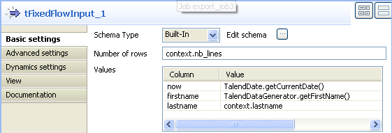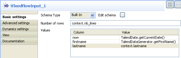 tab to define the basic settings for tFixedFlowInput.