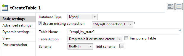 1. In the design workspace, select tCreateTable and click the Component tab to define its basic settings.