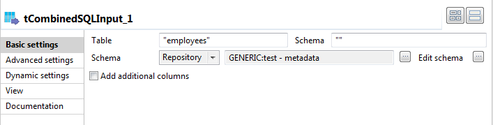 In the design workspace, select tCombinedSQLInput and click the Component tab to access the configuration panel.