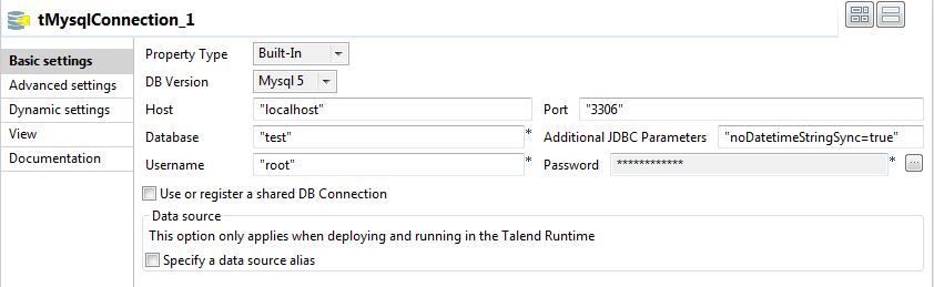 Back in the design workspace, select tMysqlConnection and click the Component tab to define its basic settings.