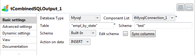 In the design workspace, select tCombinedSQLOutput and click the Component tab to access the configuration panel.