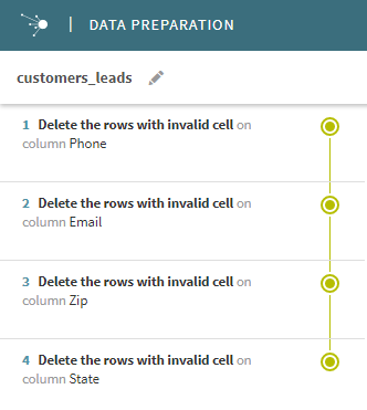 In this example, the customers_leads preparation has been created beforehand in Talend Data Preparation. This simple preparation was created on a dataset that has the same schema as the CSV file used as input for this Job, and its purpose is to remove invalid values from your customers data.