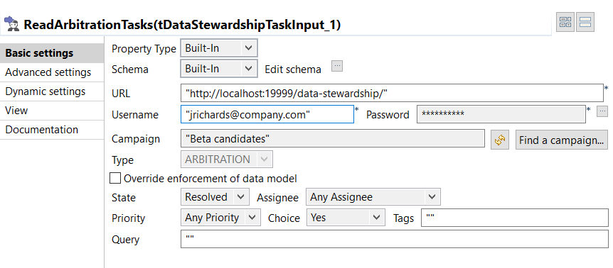 Double-click the first tDataStewardshipTaskInput component to open its Basic settings view.