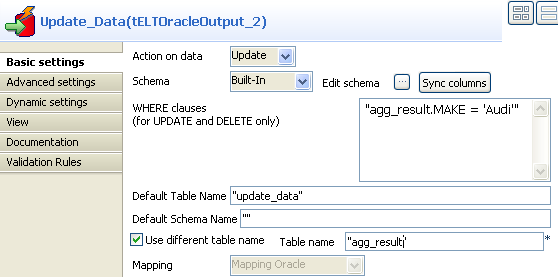 As described in Aggregating table columns and filtering, configure a Job for data aggregation using the corresponding ELT components for Oracle database - tELTOracleInput, tELTOracleMap, and tELTOracleOutput. Execute the Job to save the aggregation result in a database table named Agg_Result.