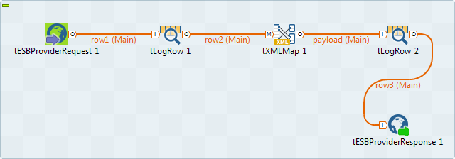 The provider Job consists of a tESBProviderRequest, a tESBProviderResponse, a tXMLMap, and two tLogRow components.