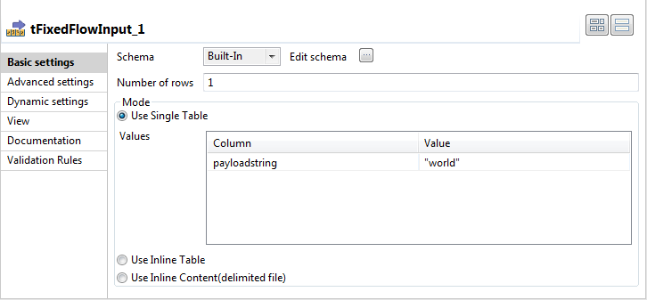 Double-click tFixedFlowInput_1 in the design workspace to display its Component view and set its Basic settings.