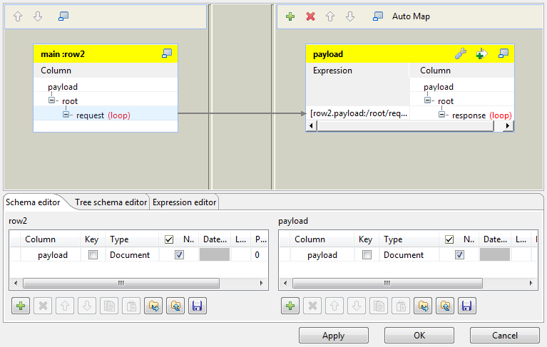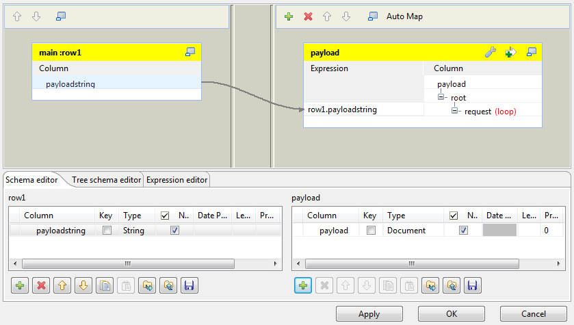 Click the payloadstring node in the input table and drop it to the Expression column in the row of the request node in the output table.