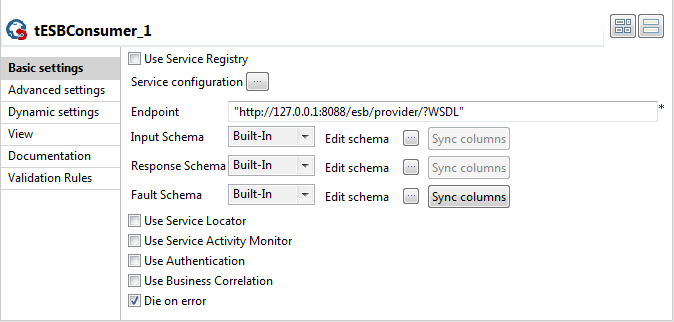 In the tESBConsumer_1 Component view, set its Basic settings.