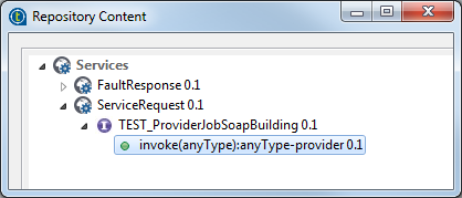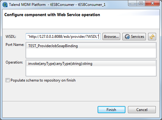 In this scenario, a provider Job and a consumer Job are needed. In the meantime, the related service should already exist in the Services node, with the WSDL URI being http://127.0.0.1.8088/esb/provider/?WSDL, the port name being TEST_ProviderJobSoapBinding and the operation being invoke(anyType):anyType.