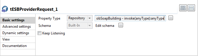 In the design workspace, double-click tESBProviderRequest_1 to display its Component view and set its Basic settings.