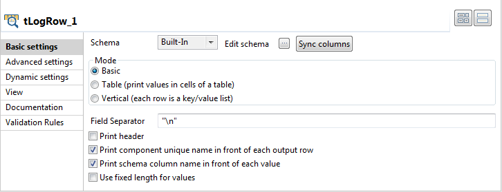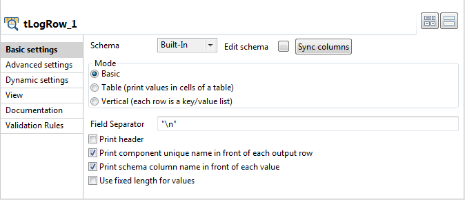 Double-click tLogRow_1 to display its Component view and set its Basic settings.
