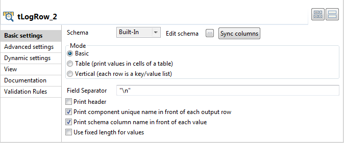 In the design workspace, double-click tLogRow_2 to display its Component view and set its Basic settings.