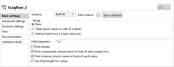 In the Job Design, double-click tLogRow_2 to display its Component view and set its Basic settings.