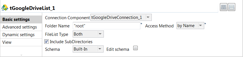 Double-click the tGoogleDriveList component to open its Basic settings view in the Component tab.