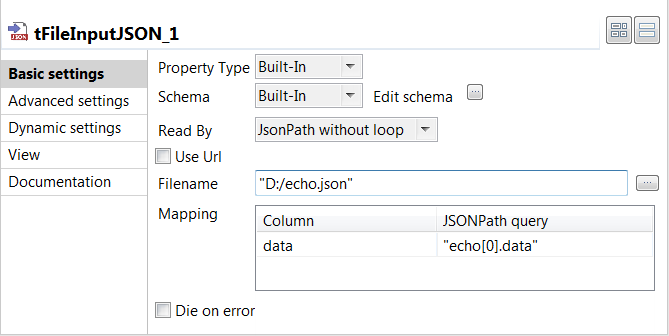 Double-click tFileInputJSON to open its