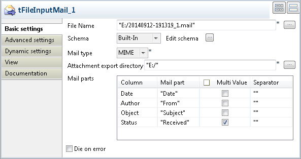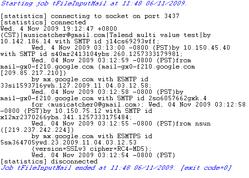The header key values are extracted as defined in the Mail parts table. Mail reception date, author, subject and status are displayed on the console.