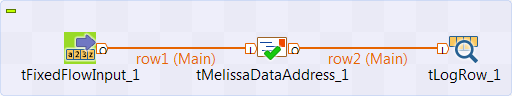 This Job uses the tFixedFlowInput component to generate the address data to be analyzed, the tMelissaDataAddress component to analyze the input schema and validate, correct and standardize the US addresses generated by the tFixedFlowInput component and a tLogRow component to output the correct formatted addresses on the console.
