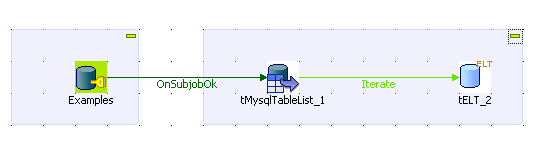 Drop the following two components from the Palette onto the design workspace: tMysqlTableList and tELT.