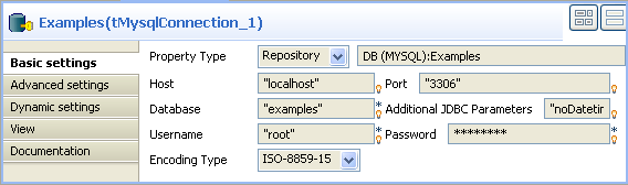 If needed, double-click tMysqlConnection to display its Basic settings view and verify the connection details.