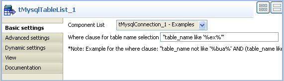 In the design workspace, double-click tMysqlTableList to display its Basic settings view and define its settings.