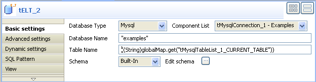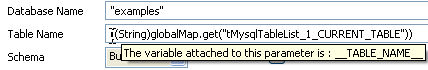 In the SQL template code, you must use the correct variable name attached to the table name parameter ("__TABLE-NAME__" in this example). To display the variable name used, put your pointer in the Table Name field in the basic settings of the tELT component.