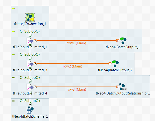 One tNeo4jBatchSchema component: it creates an uniqueness constraint on the nodes in the database.