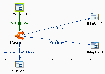 Connect tParallelize_1 to tMsgBox_2 and tMsgBox_3 using a Parallelize link for each, available on the right-click menu.These links will simply parallelize the execution of the two connected subJobs.