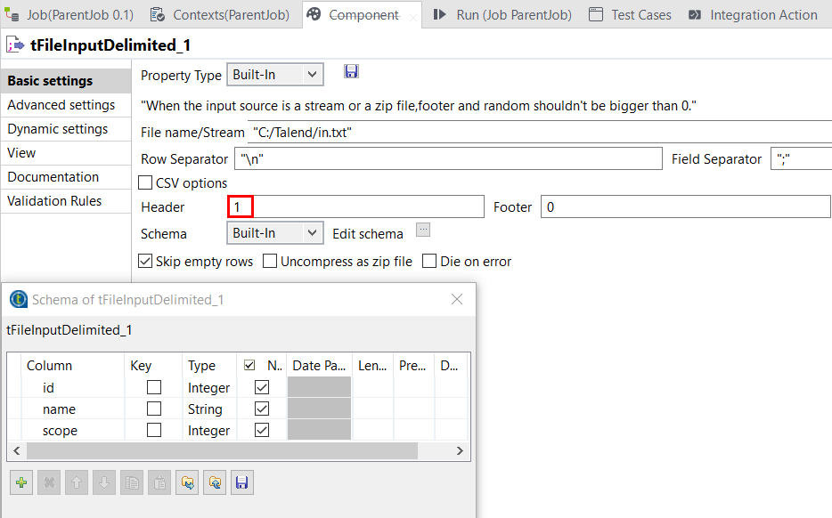 • Click the Edit schema button and add three columns to the schema, id as Integer, name as String and scope as Integer.