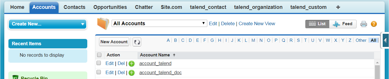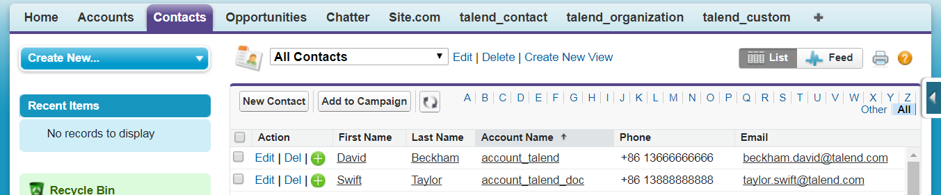As shown above, two Account records account_talend and account_talend_doc are successfully inserted, two Contact records Beckham David and Taylor Swift are successfully inserted and updated based on the mapping relationship with the external IDs in the Account object, and another Contact record missing the value for the required field LastName is not inserted.