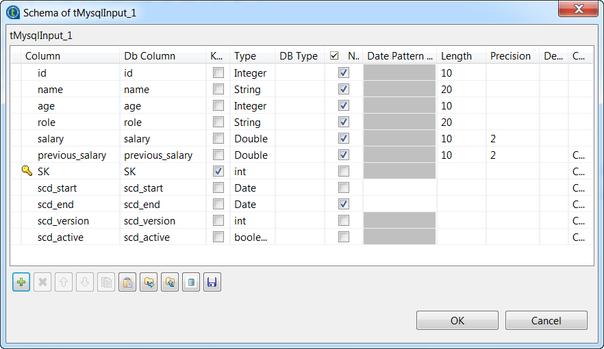 Open the schema editor of the tMysqlSCD component, select and copy all its schema columns, then