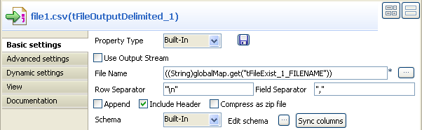 Set Schema to Built-in and click Sync columns to synchronize the output file schema (file1) with