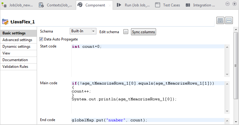 This code then displays the age that has been indexed as 0 by the tMemorizeRows component. When the tJavaFlex
