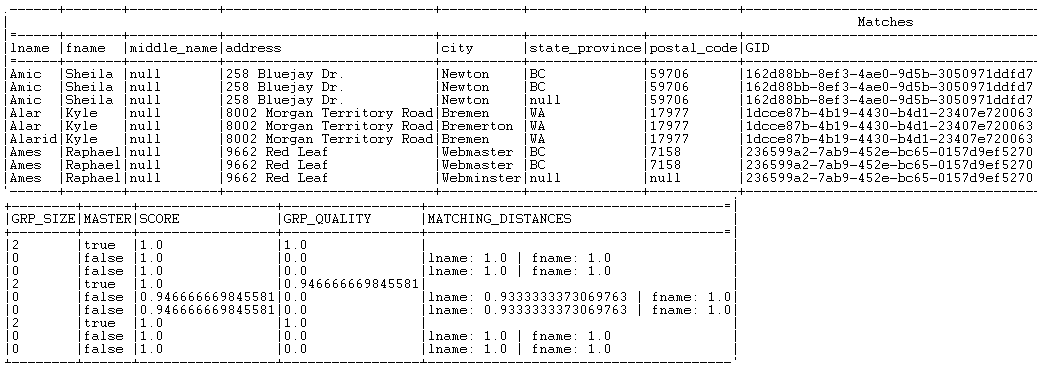 The number of records in each of the three output blocks is listed in the GRP_SIZE column and computed only on the master record. The MASTER column indicates with true or false whether the corresponding record is a master record or not. The SCORE column lists the calculated distance between the input record and the master record according to the Jaro-Winkler and Jaro matching algorithms.
