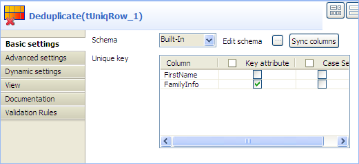 - In the Unique key area, select the Key attribute check box for the FamilyInfo column to carry out deduplication on the family information.