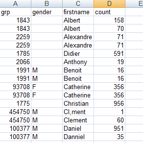 The input file contains four columns: grp, gender, firstname and count. The data in the input file has problems such as duplication, first names spelled differently or wrongly and different information for the same customer.