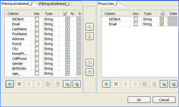 4. In the Key definition area of the Basic settings view of tFuzzyJoin, click the plus button to add two columns to the list and then select the input columns and the output columns you want to do the fuzzy matching on from the Input key attribute and Lookup key attribute lists respectively, IdClient and Email in this example.