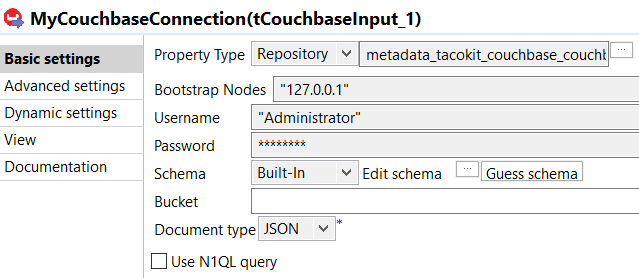 Double-click tCouchbaseConnection to open its Basic settings view.