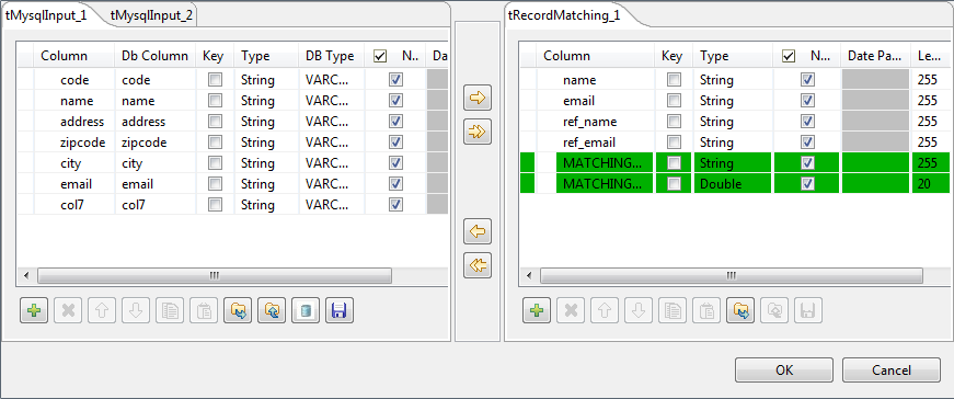 In this example, you want to pass to the tRecordMatching component the name and email columns from the first tMysqlInput component, and the ref_name and ref_ email columns from the second tMysqlInput component.The MATCHING_DISTANCE and the MATCHING_WEIGHT columns in the output schema are defined by default.The MATCHING_WEIGHT column is always between 0 and 1. It is a global distance between sets of columns (defined by the columns to be matched).The MATCHING_DISTANCE column will print a distance for each of the columns on which you use an algorithm. The results will be separated by a vertical bar (pipe).Click OK to close the dialog box and proceed to the next step. - In the Key Definition area of the Basic settings view of tRecordMatching, click the plus button to add two columns to the list.