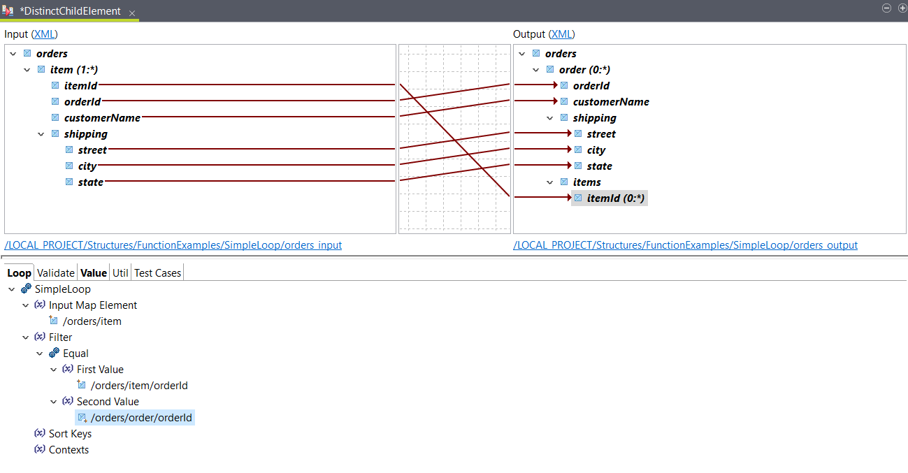 Use a SimpleLoop function with a Distinct Child Element property to group loop iterations based on the value of a child element.