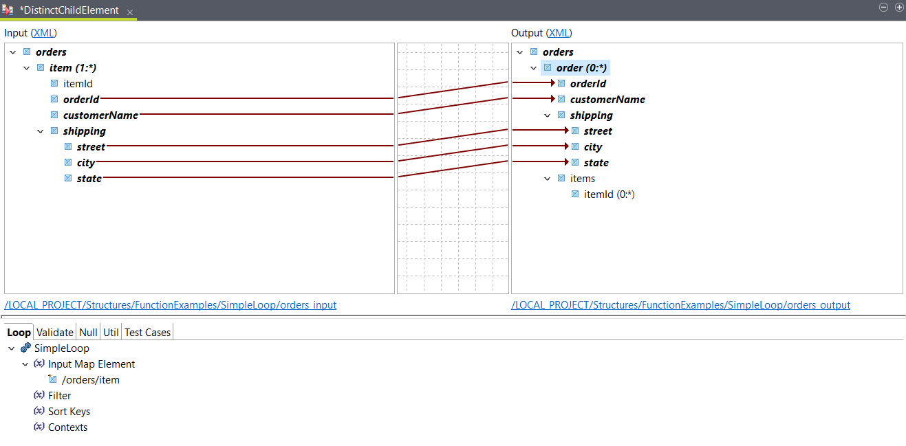 Use a SimpleLoop function with a Distinct Child Element property to group loop iterations based on the value of a child element.