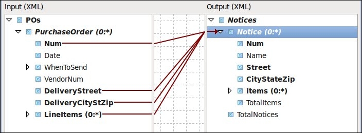 Matching loops (shown in example Maps/Looping/LoopSimple) are the easiest looping case. In this case, there is a loop in the output and a loop in the input (at the same level of looping), and you want an output element for each input element. Most of the time the matching looping is correctly calculated automatically when you map an input value to an output value. Here, the PurchaseOrder element in the input matches the Notice loop in the output.