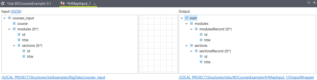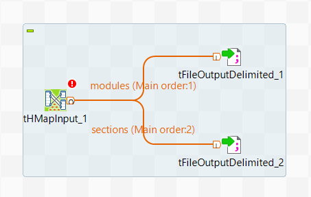 8. Link the tHMapInput to the two tFIleOutputDelimited components with Row > Main connections named modules and sections and click Yes when asked if you want to get the schema from the target component.